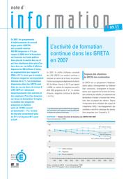 En 2007, les groupements d'établissements du second degré public (GRETA) ont accueilli environ 456 500 stagiaires (+ 4 % par rapport à 2006). Par contre, le nombre de GRETA diminue, en raison de la fusion de certains d'entre eux. Le chiffre d'affaires dépasse les 400 millions d'euros, mais la durée moyenne des formations en heures diminue par rapport à 2006. Près d'un stagiaire sur deux est un demandeur d'emploi. Les stagiaires sont en majorité des ouvriers qualifiés et des employés ; six sur dix sont des femmes. En encadrés : définition des GRETA ; financement des prestations de formation des GRETA.